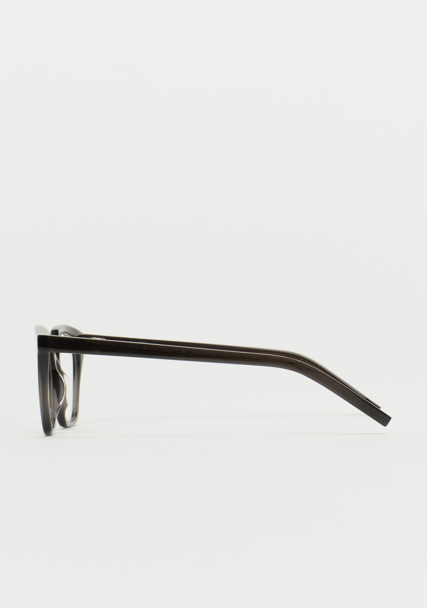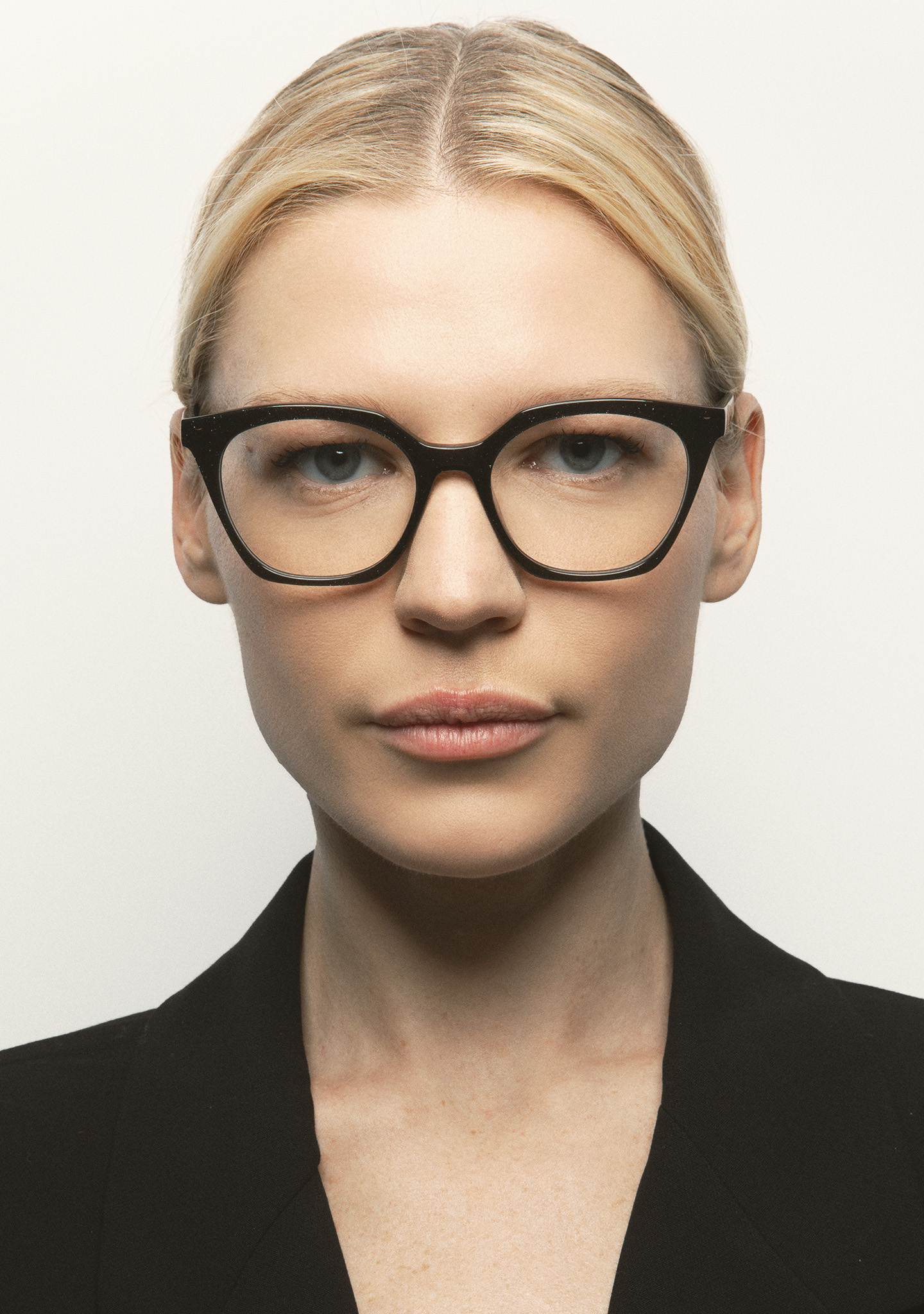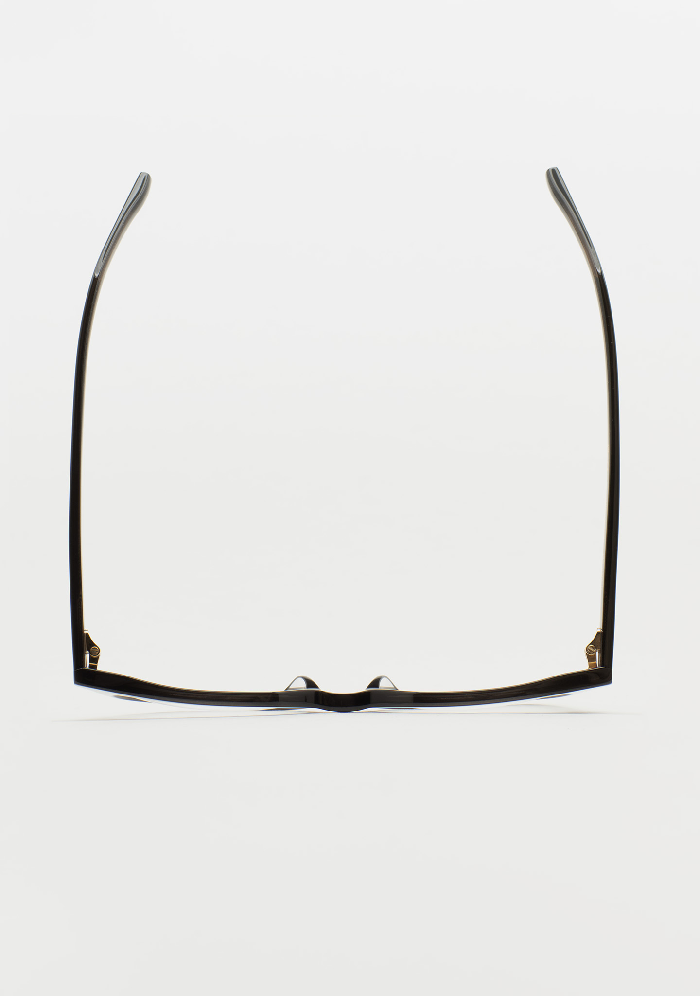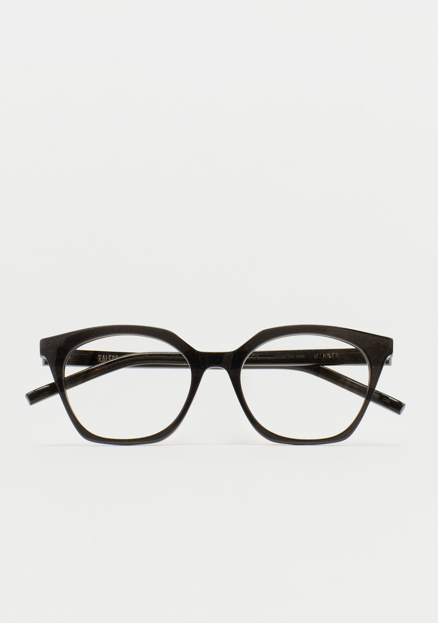 Lunettes de vue cat-eye. Design avec des détails qui font la différence. Face avant et branches en acétate noir pailleté. Plaquettes de nez en acétate intégrées. Fabriquées à la main.