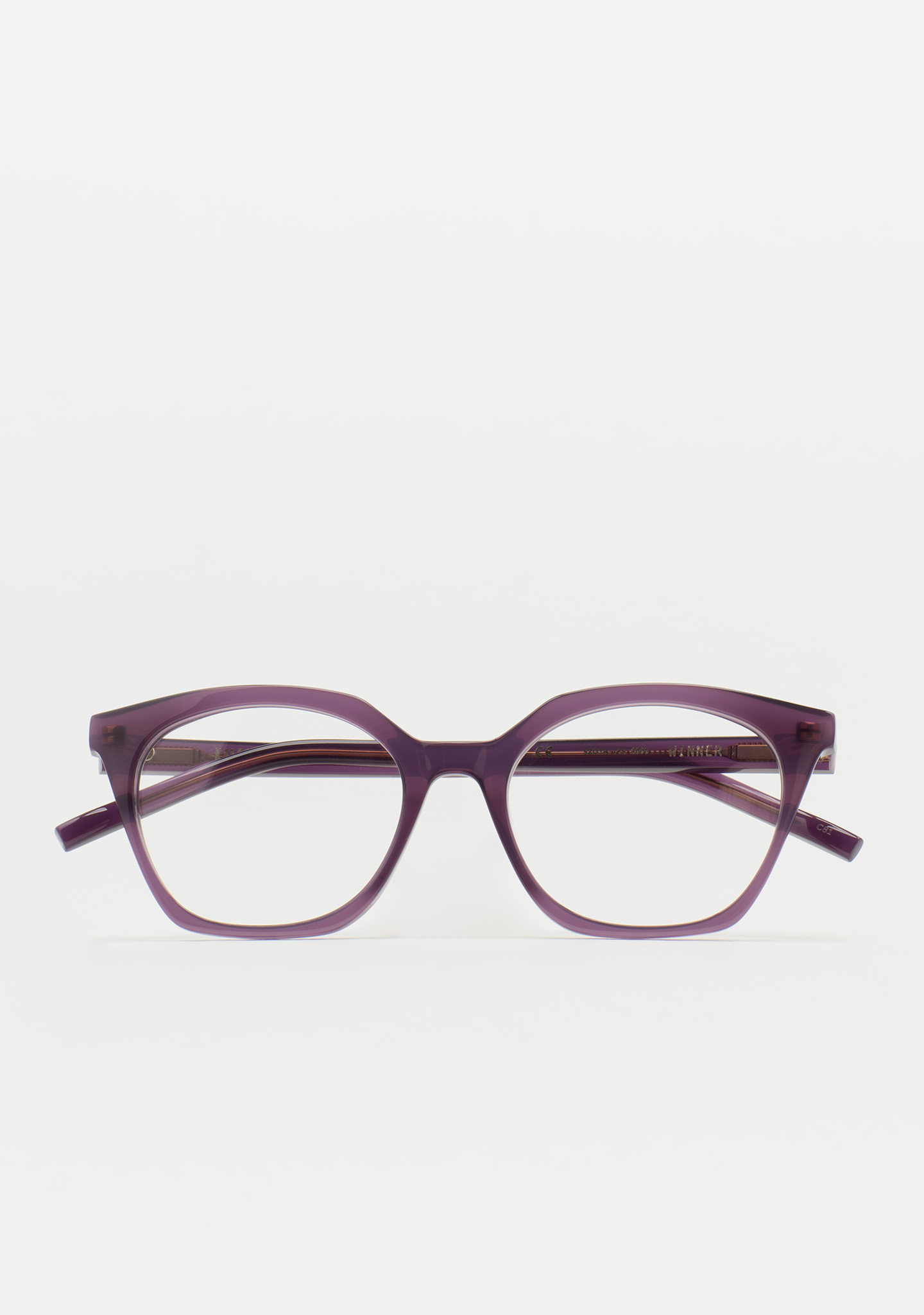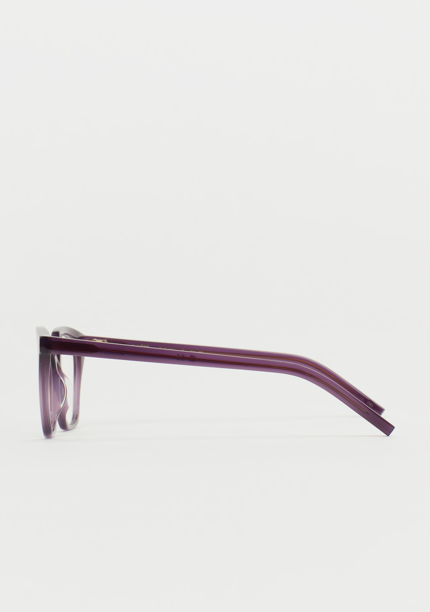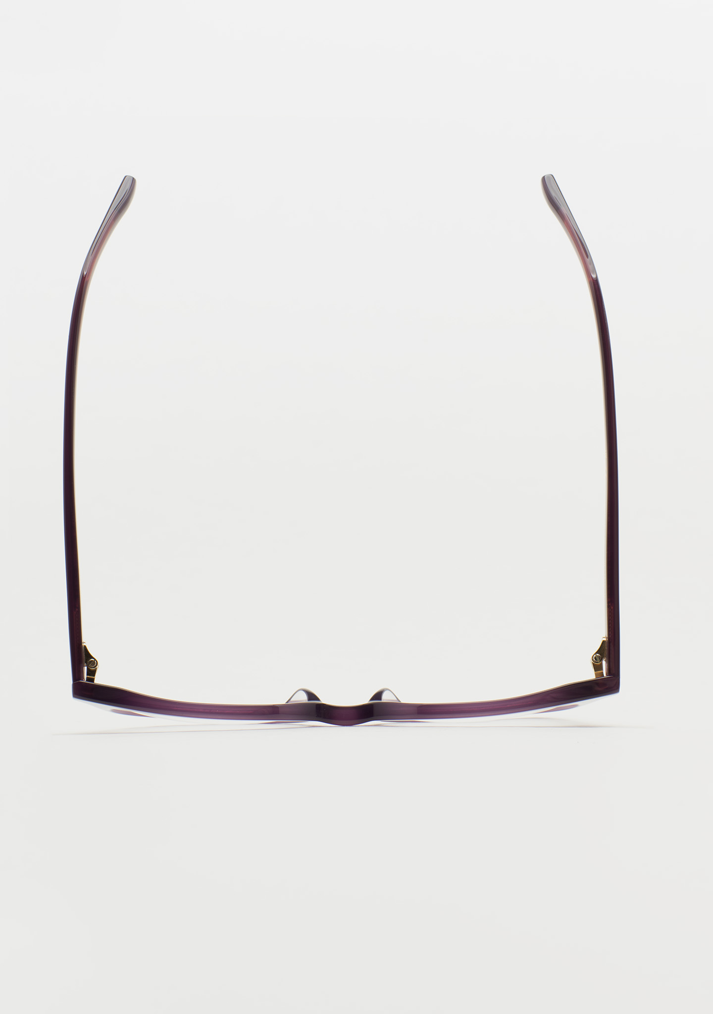 Lunettes de vue cat-eye. Design avec des détails qui font la différence. Face avant et branches en acétate violet transparent. Plaquettes de nez en acétate intégrées. Fabriquées à la main.