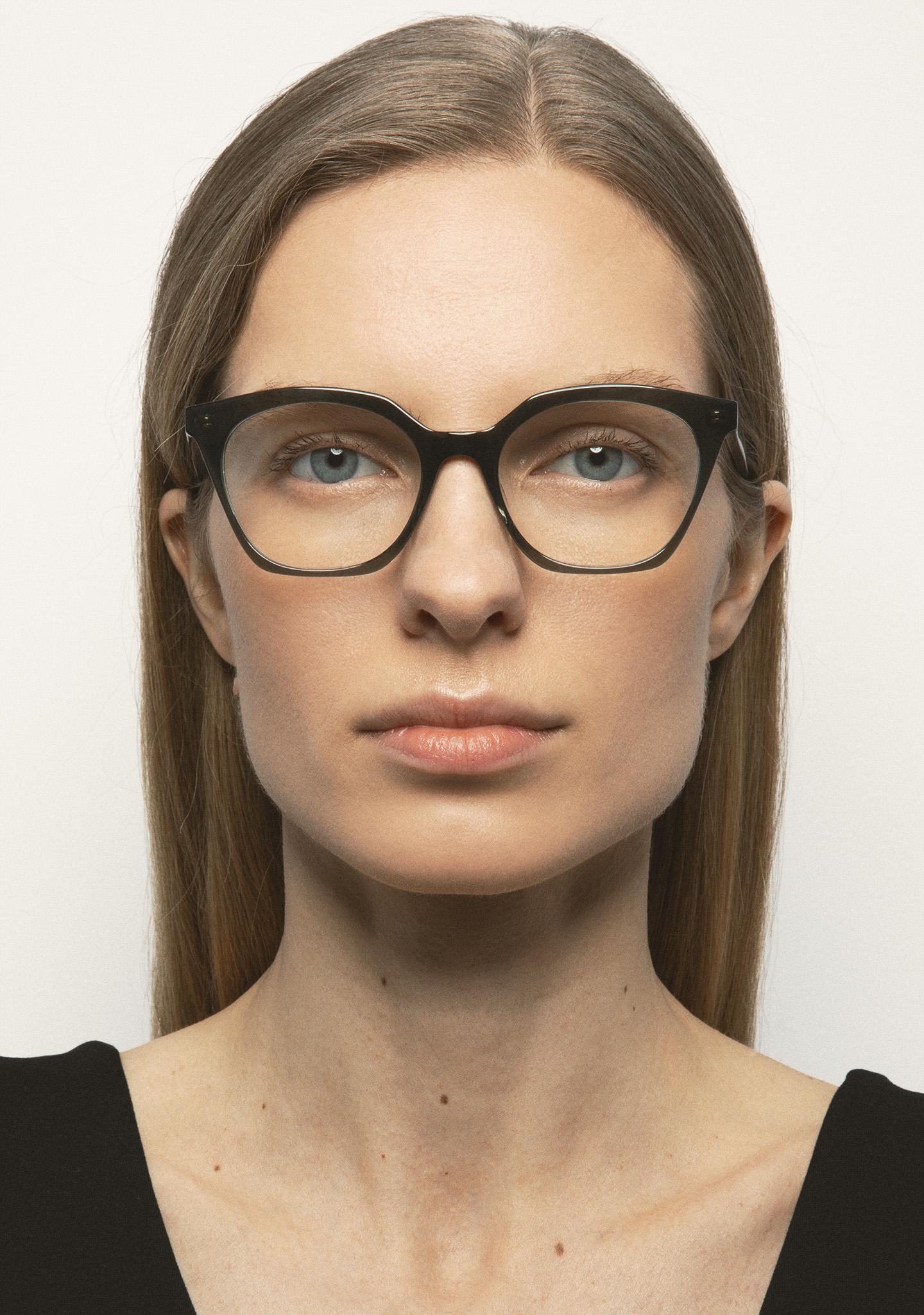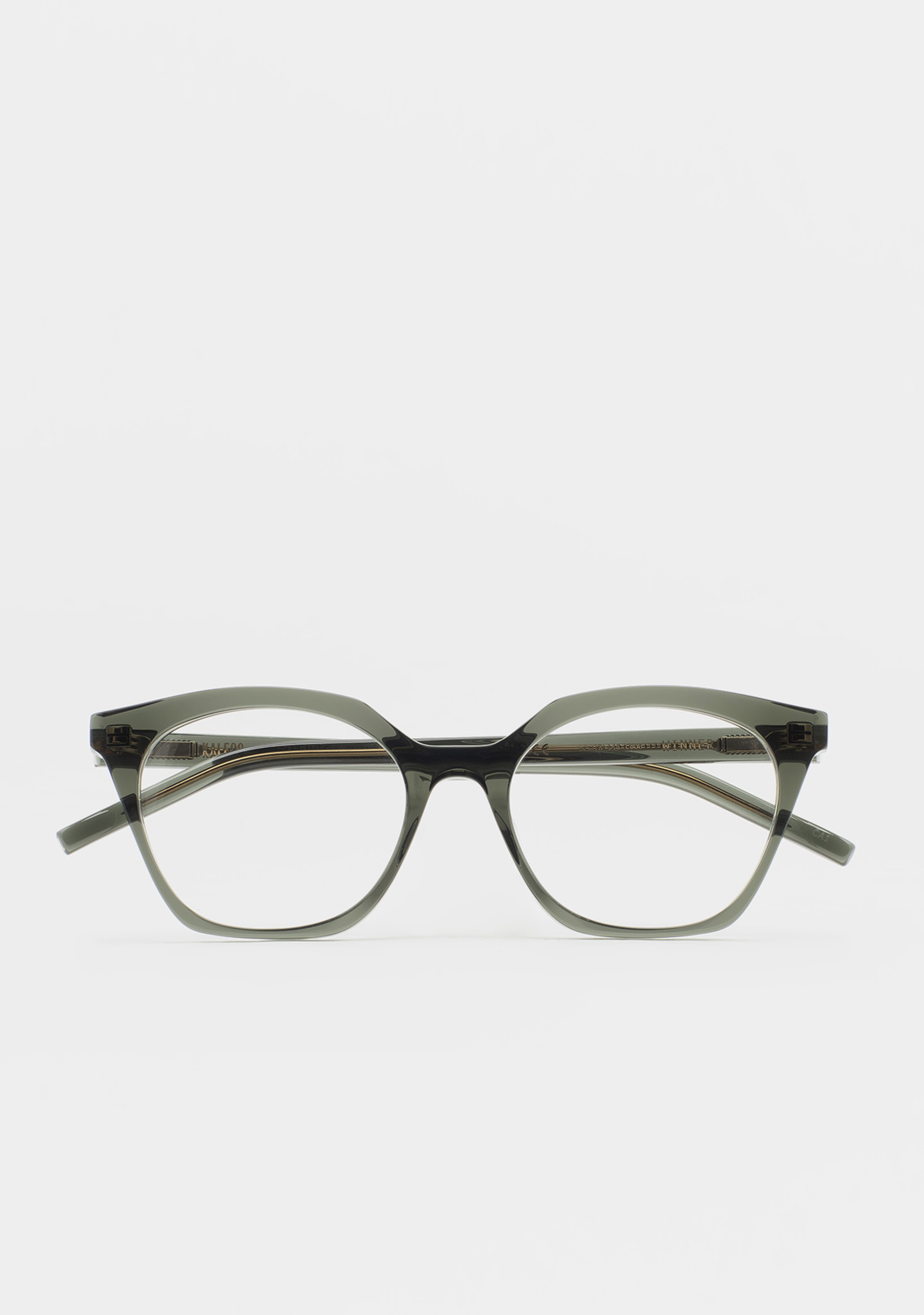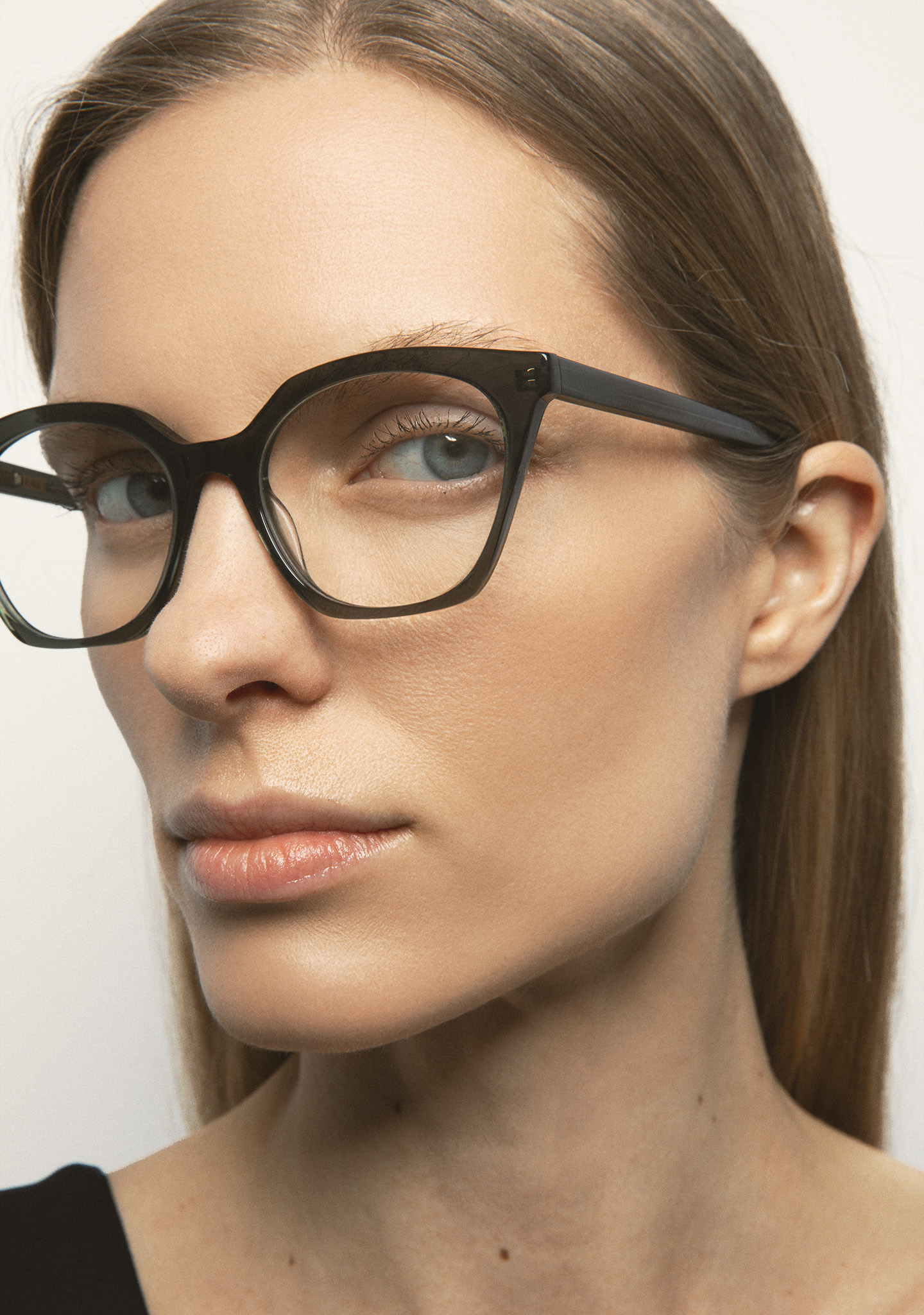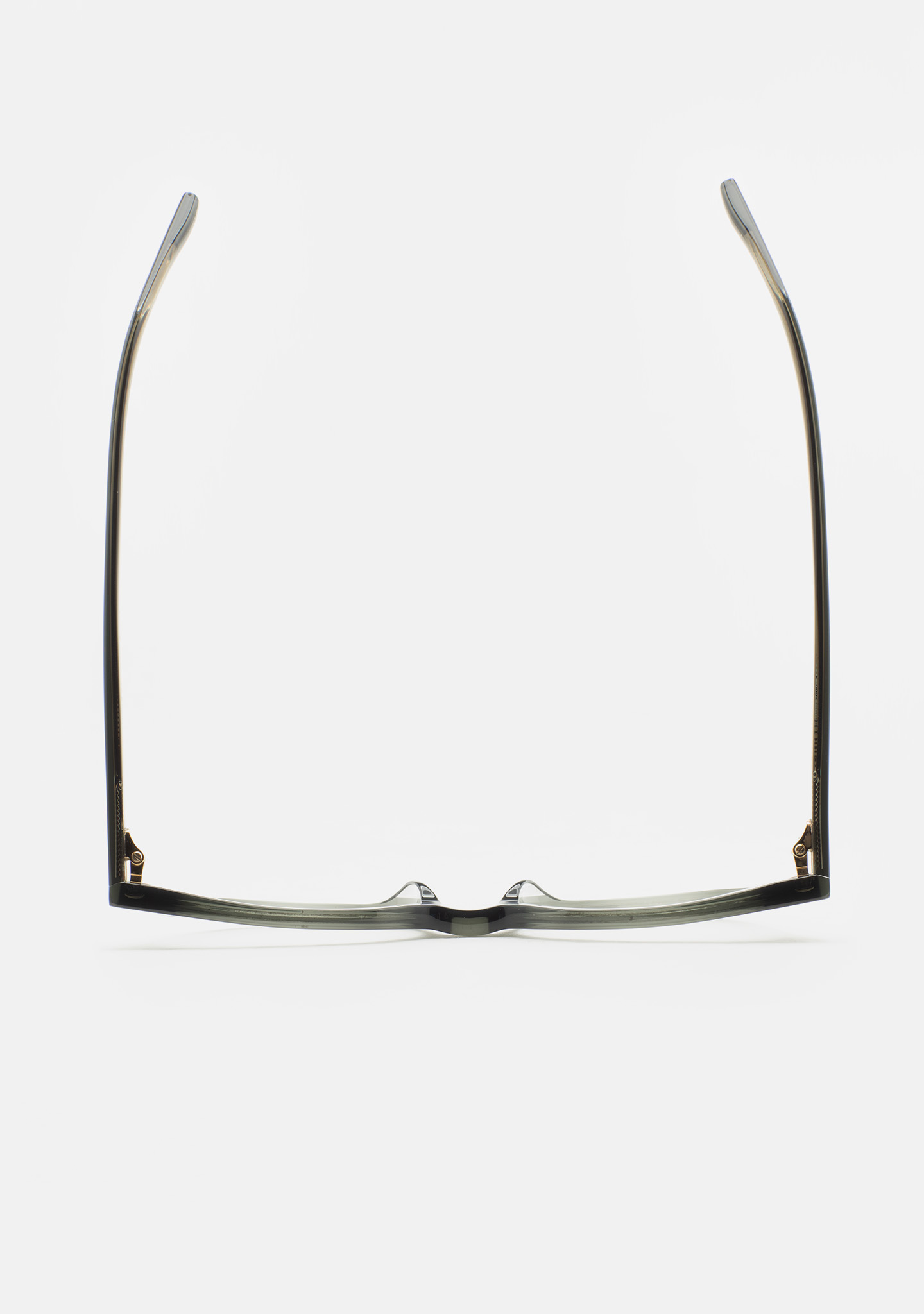 Lunettes de vue de forme cat-eye. Un design avec des détails qui font la différence. Face et branches en acétate vert grisâtre transparent. Plaquettes en acétate intégrées. Fabriquées à la main.