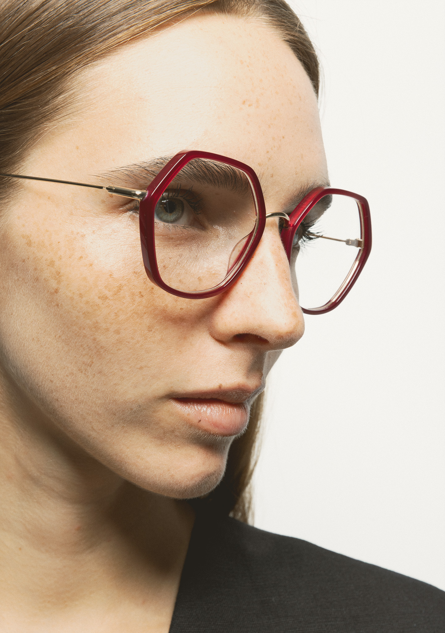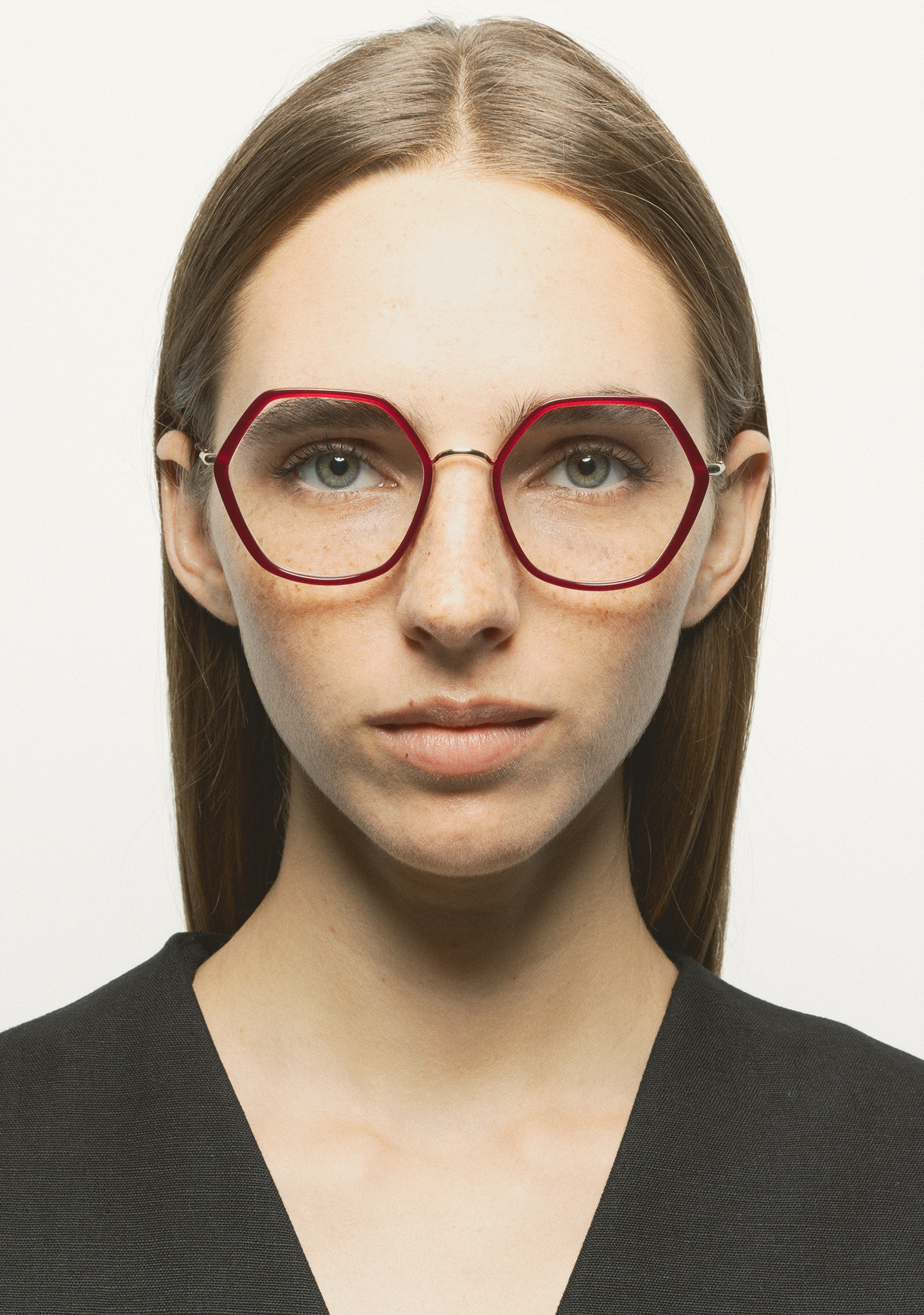 Lunettes de vue hexagonales. Design pensé dans chaque angle. Face avant en acétate rouge. Structure et pont en acier inoxydable doré. Branches en acier inoxydable avec embouts en acétate rouge. Plaquettes de nez en acétate intégrées. Fabriquées à la main.