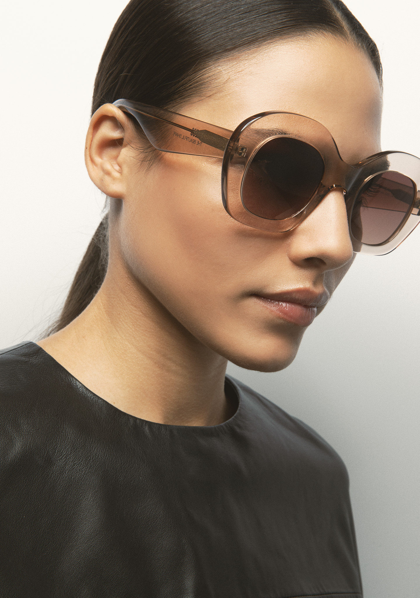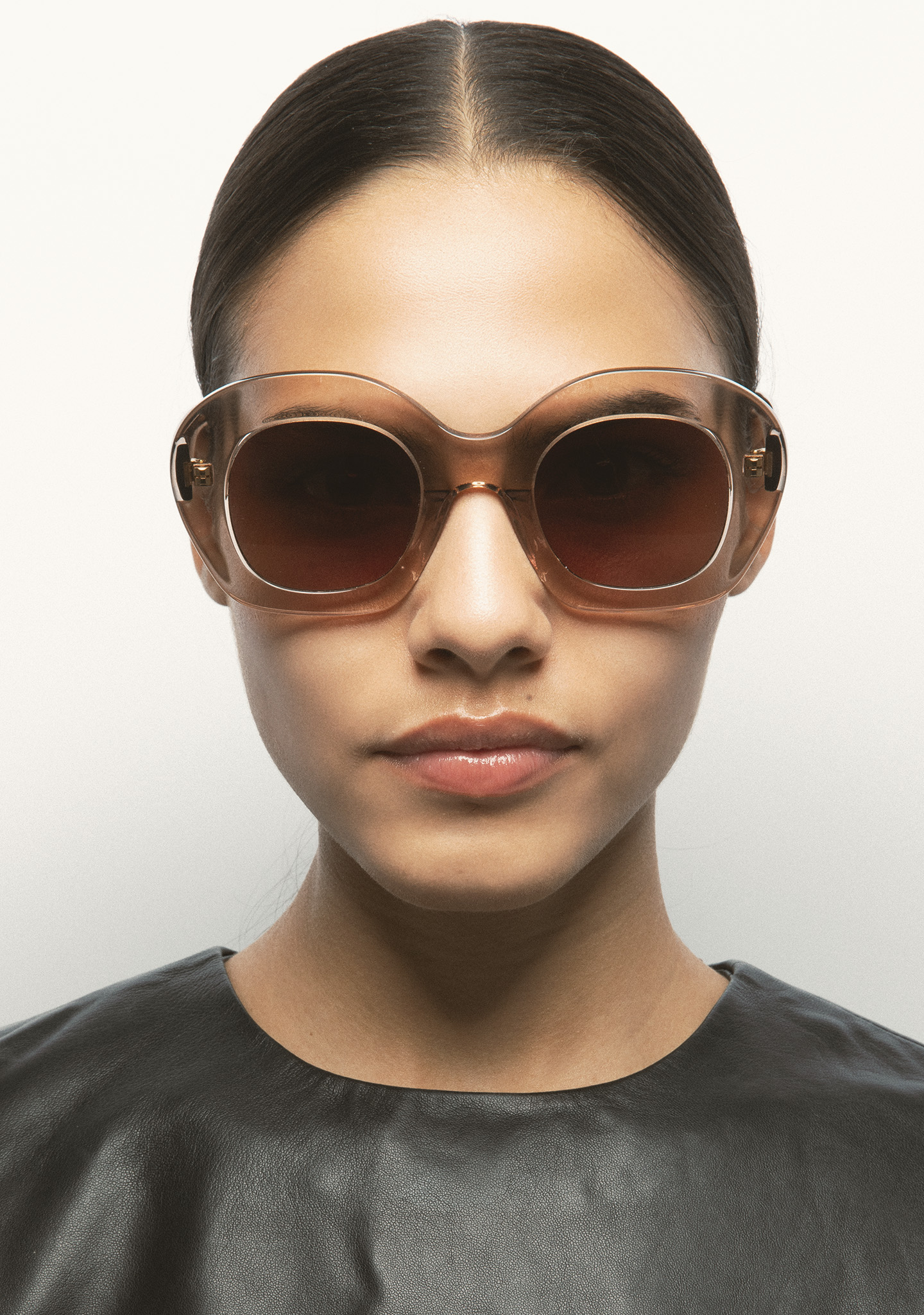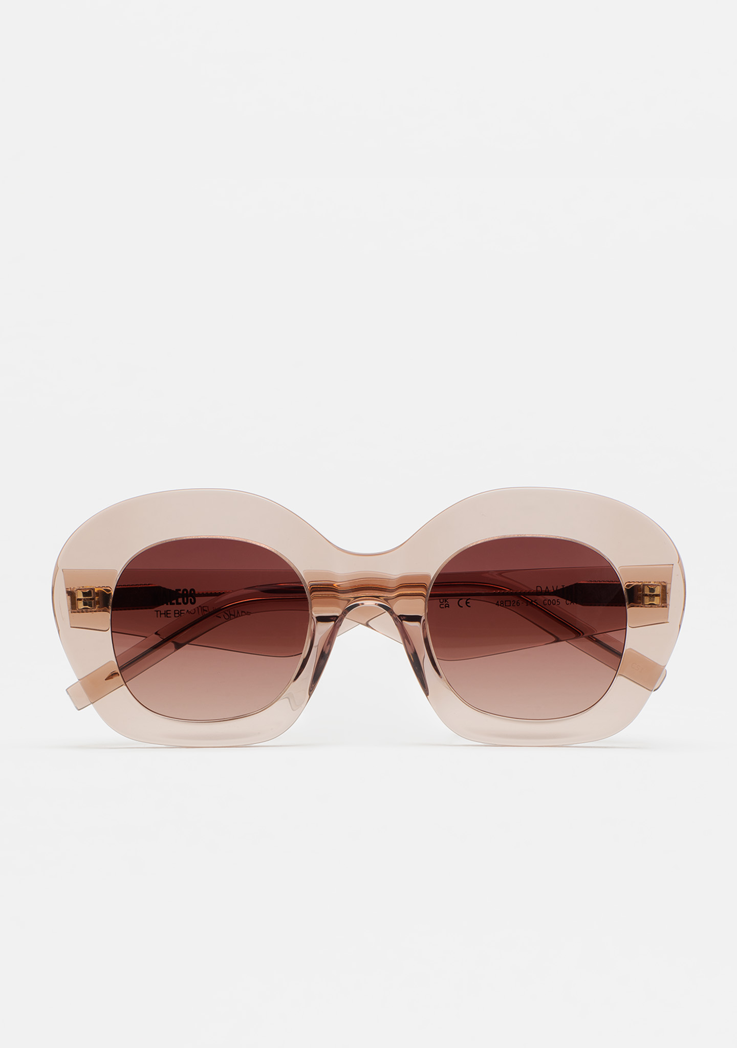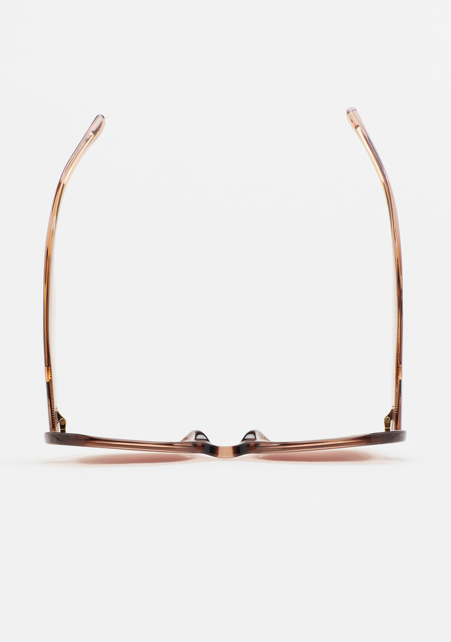 Lunettes de soleil de forme arrondie. Face et branches en acétate rose clair transparent. Verre marron dégradé base 2 avec protection UV 100 % et traitement antireflet. Verre catégorie 3. Plaquettes en acétate intégrées. Fait main.