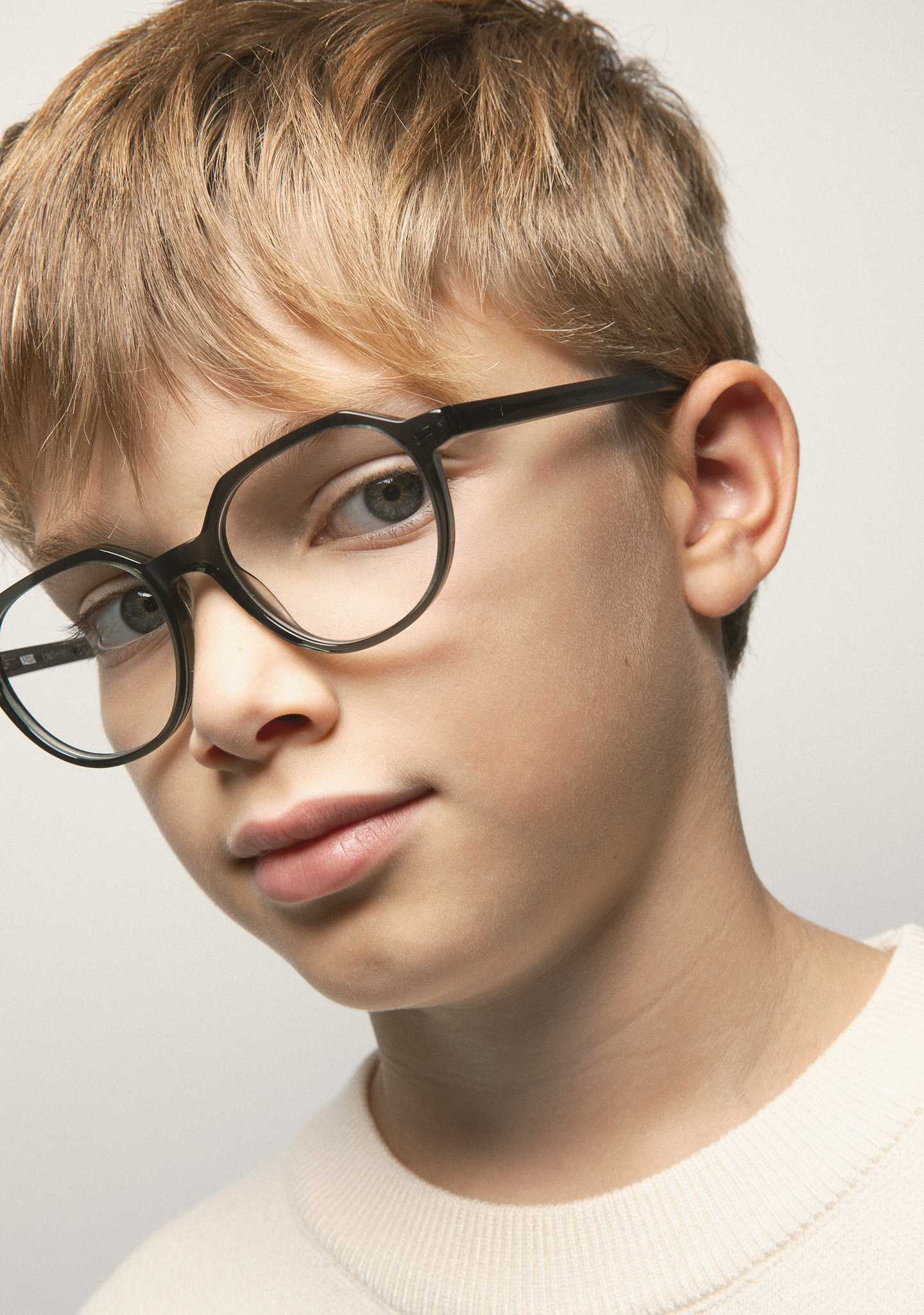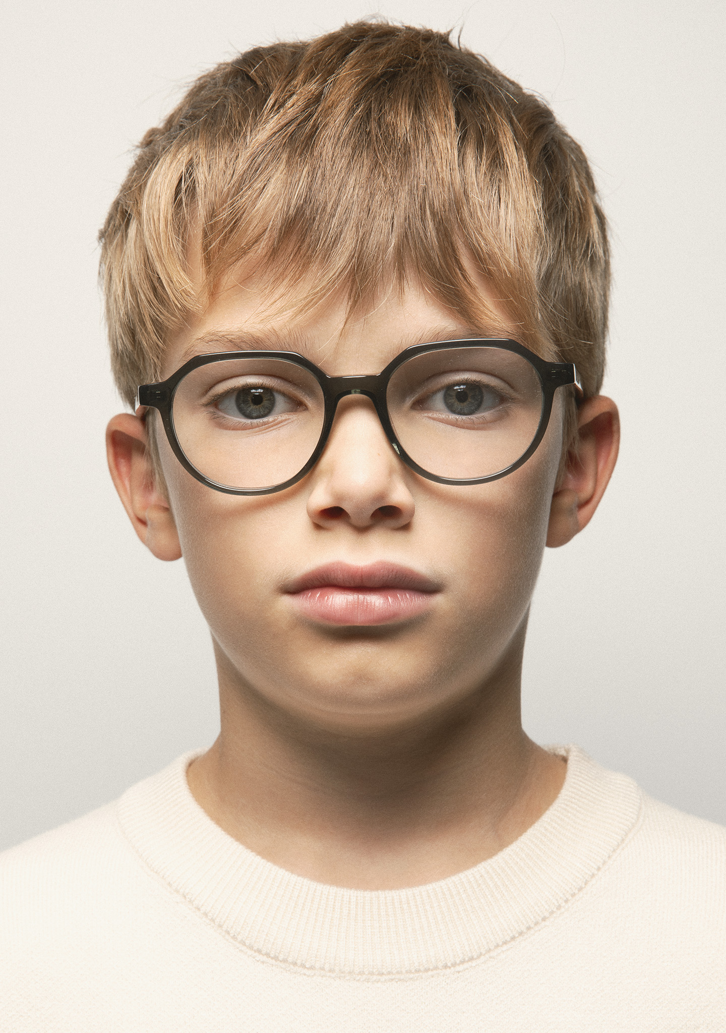 Lunettes de vue KIDS pantos avec partie supérieure légèrement plus droite. Monture en acétate gris foncé transparent. Branches en acétate gris foncé transparent avec manchons ambre translucide. Plaquettes en acétate fixes. Fait main.