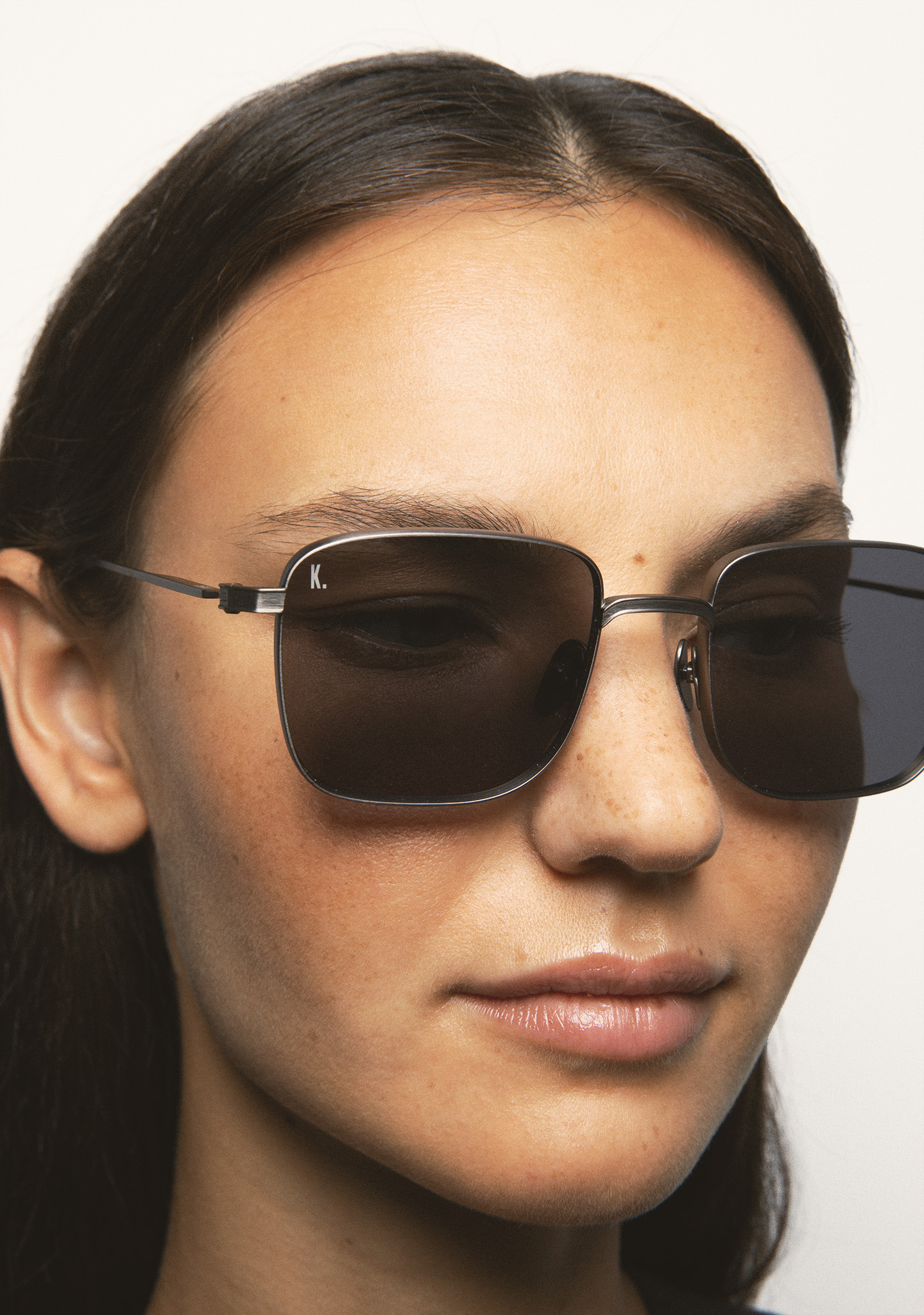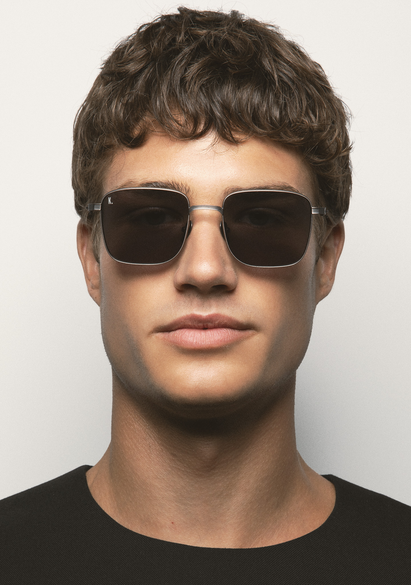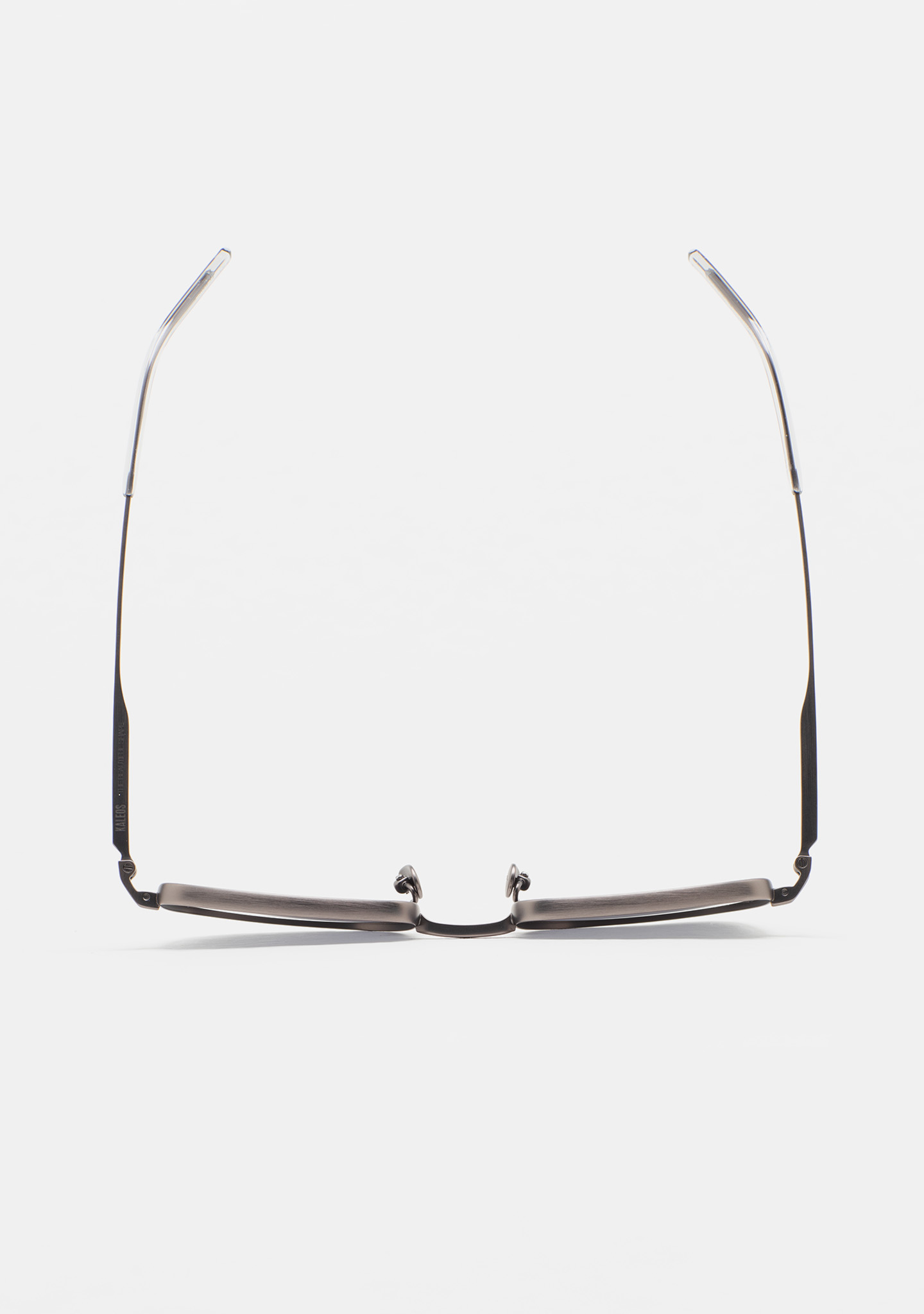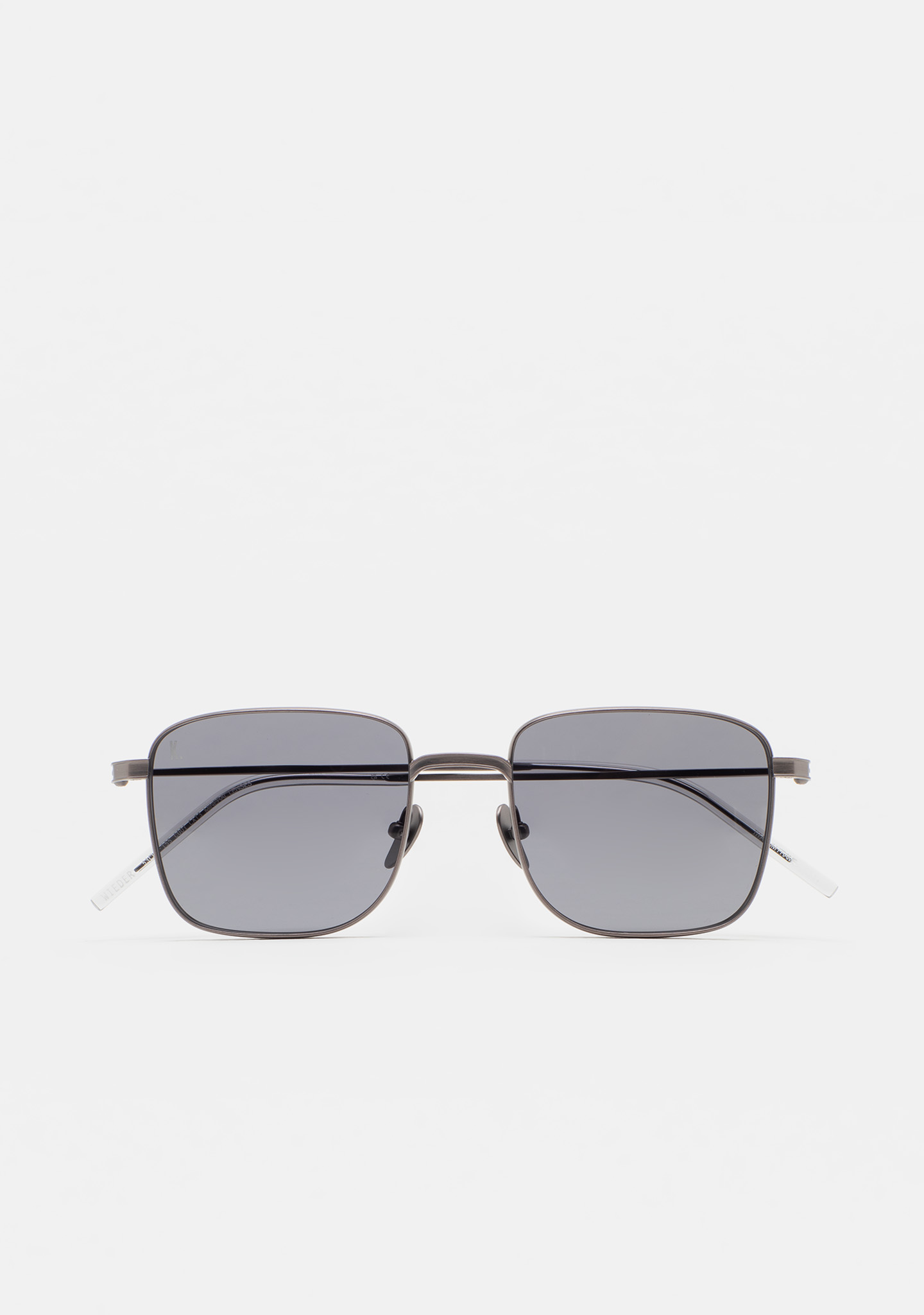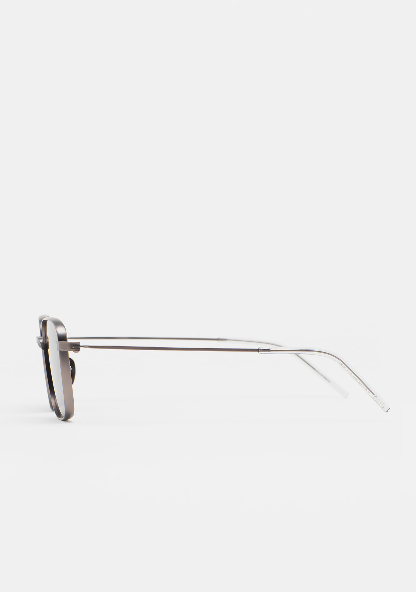 Occhiali da sole di forma rettangolare. Frontale e aste in titanio argento. Aste con terminale in acetato grigio trasparente. Lente grigia minerale base 2 con protezione UV 100% e trattamento antiriflesso. Lente Categoria 3. Plaquettes incorporate. Fatto a mano.