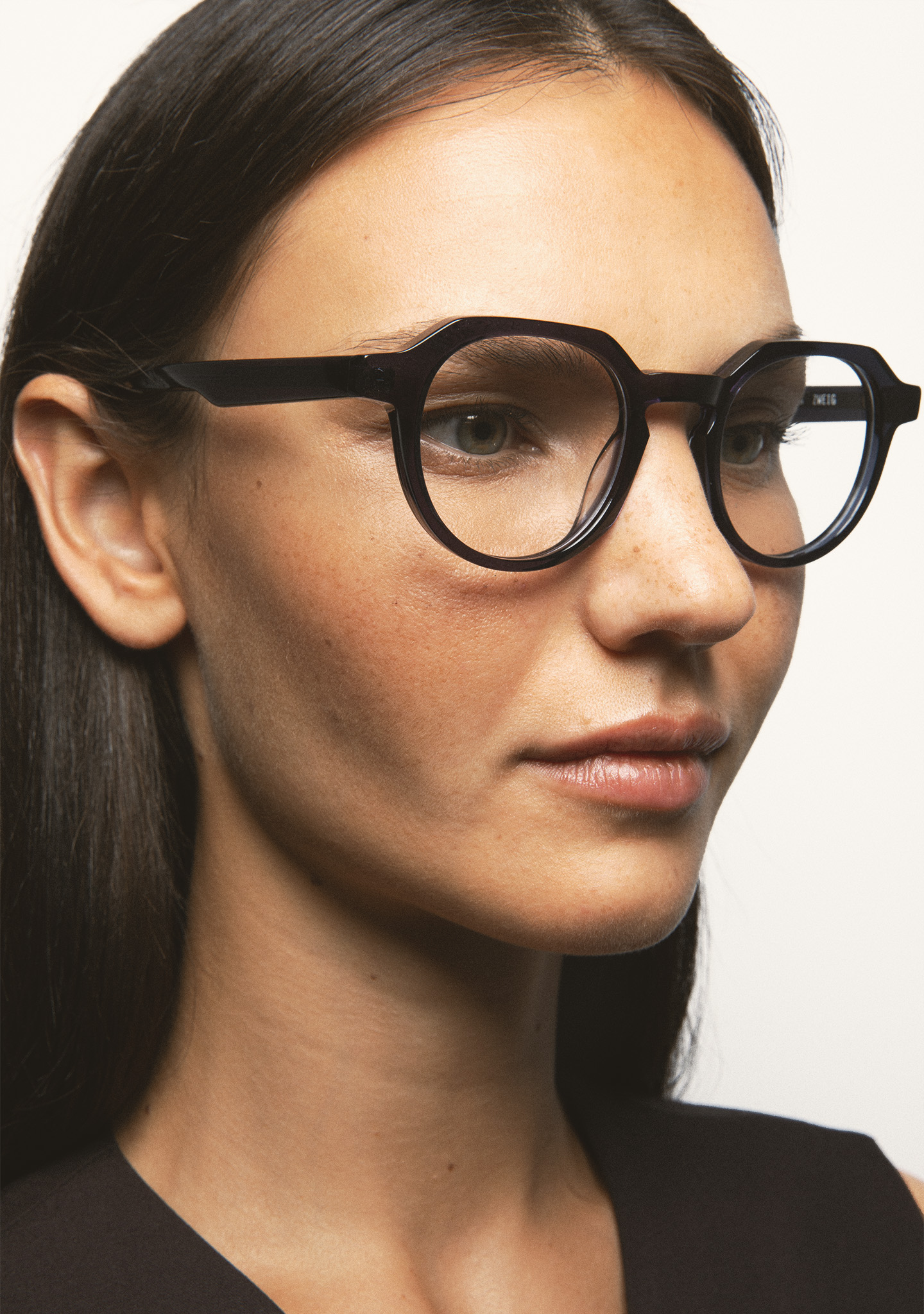 Occhiali da vista Pantos con sopracciglio piatto e ponte a chiave. Frontale e aste in acetato blu grigio trasparente. Piastrine in acetato integrate. Realizzati a mano.