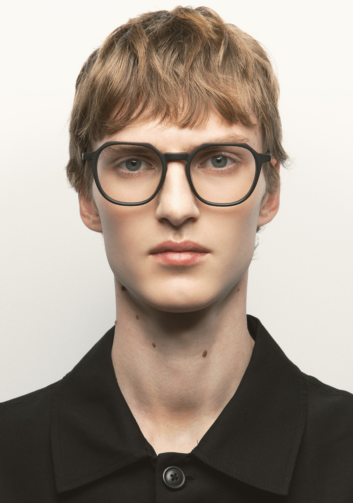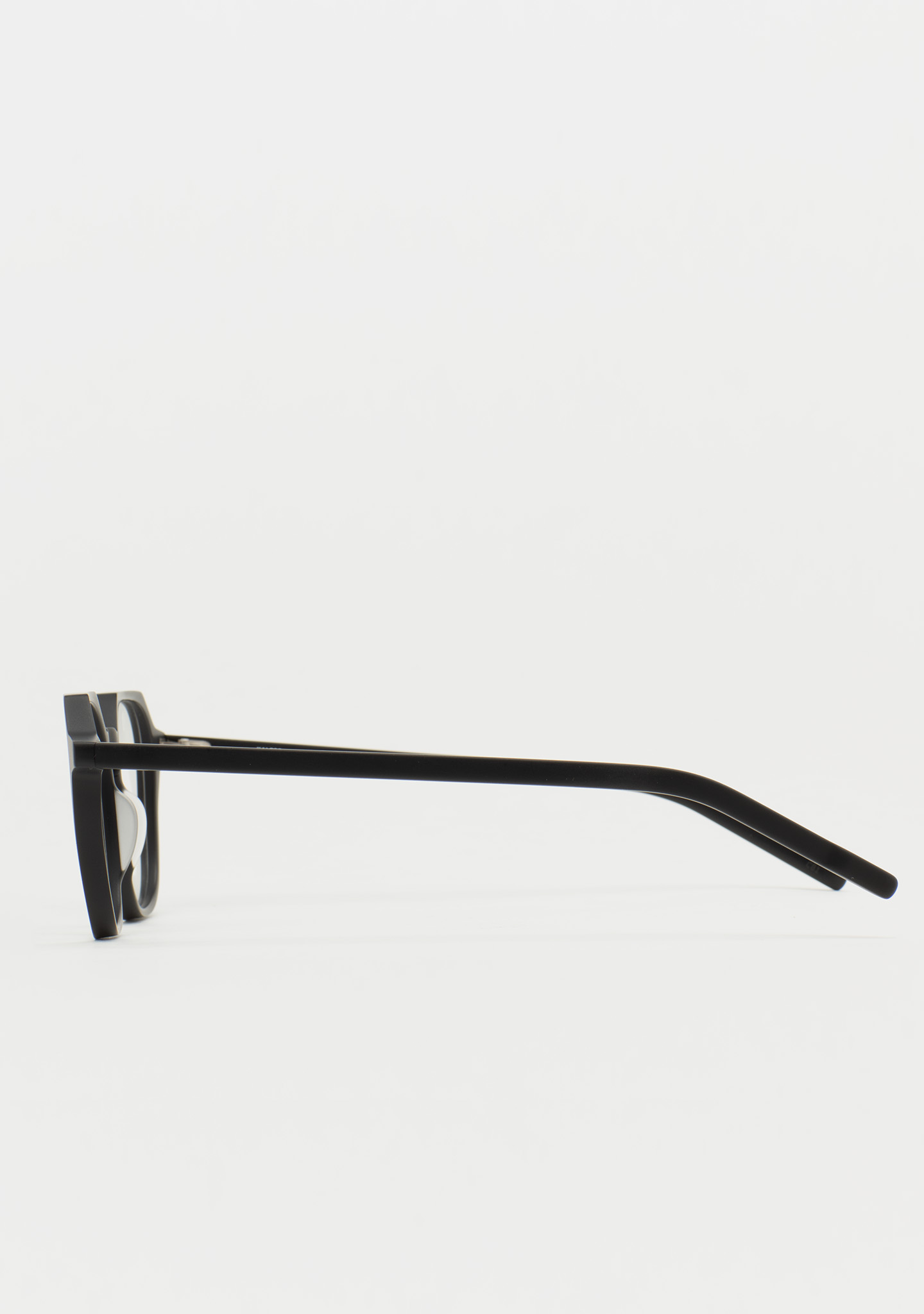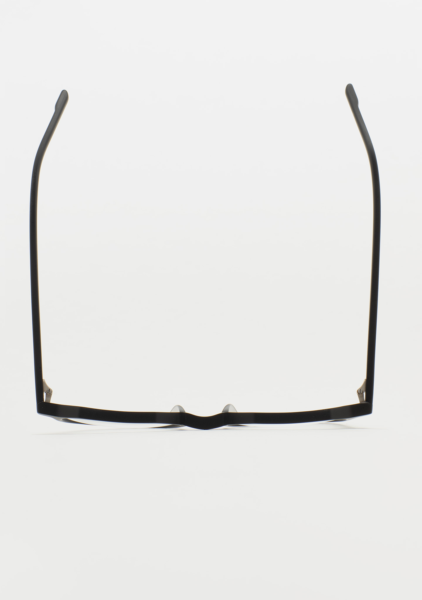 Occhiali da vista dalla forma quadrata con linea sopraccigliare piatta. Un’architettura che si percepisce leggera e forte allo stesso tempo. Frontale e aste in acetato nero opaco. Naselli in acetato integrati. Realizzati a mano.