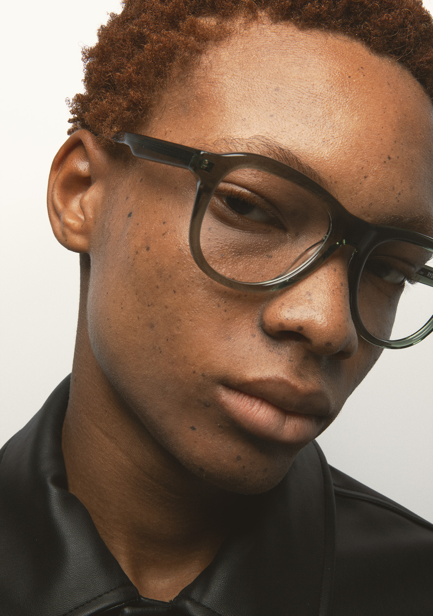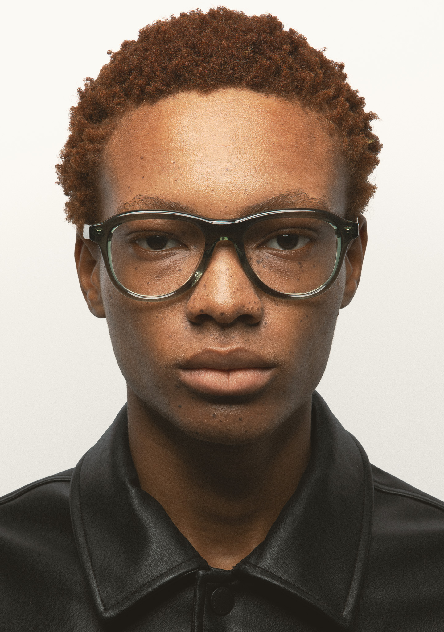 Occhiali da vista di forma aviator. Frontale e aste in acetato verde trasparente. Plaquettes in acetato incorporate. Fatto a mano.