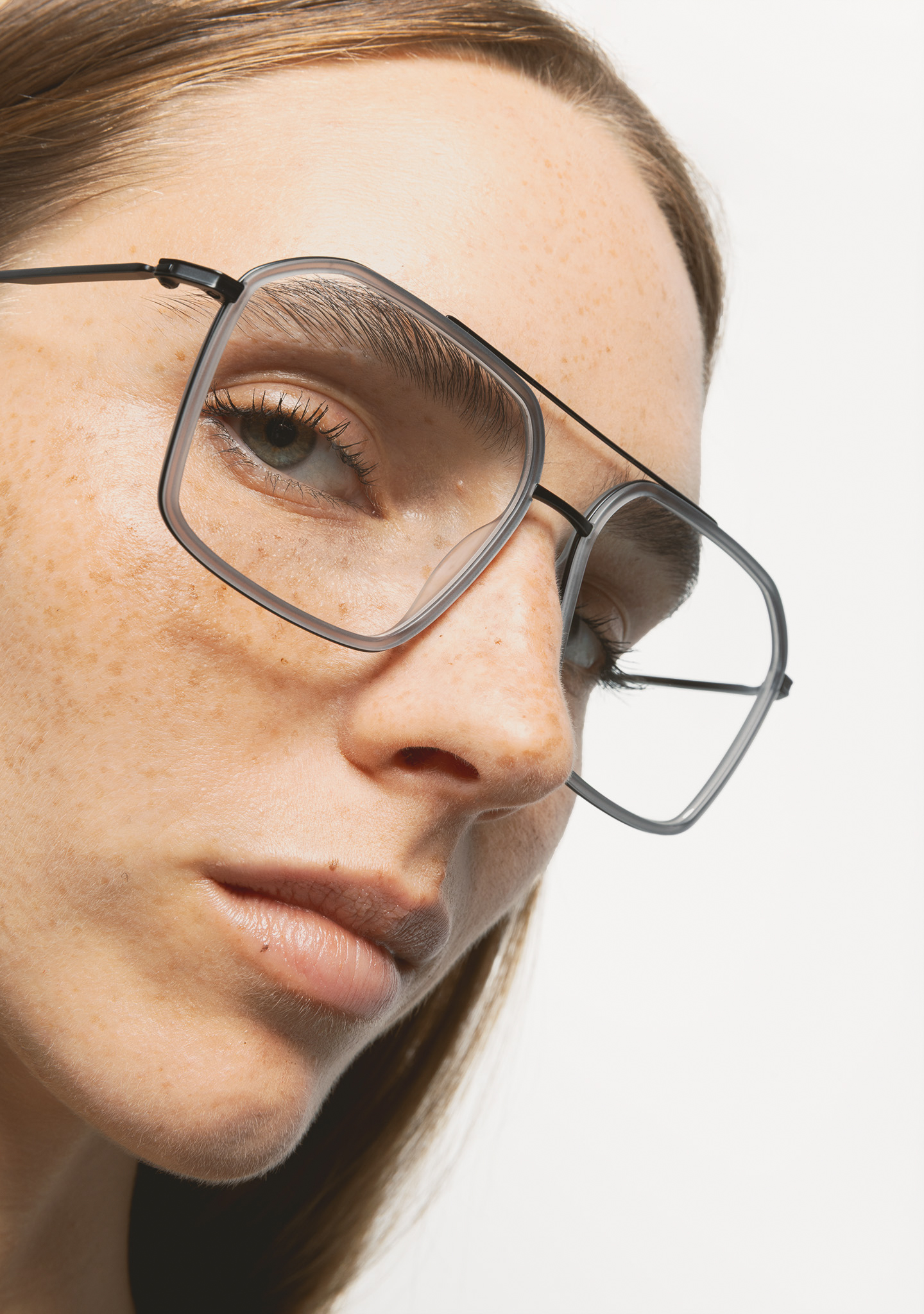 Occhiali da vista dalla forma aviator con doppio ponte. Frontale in titanio con cerchio in acetato high density grigio trasparente opaco. Ponte e aste in titanio nero, con terminali in acetato grigio trasparente. Naselli in acetato integrati. Realizzati a mano.