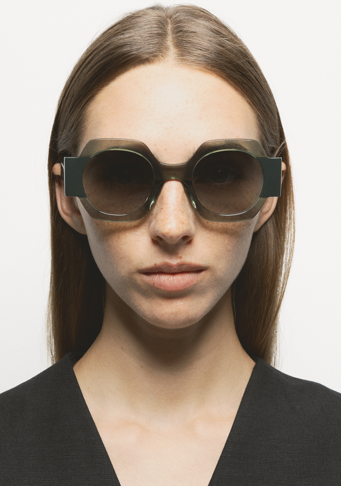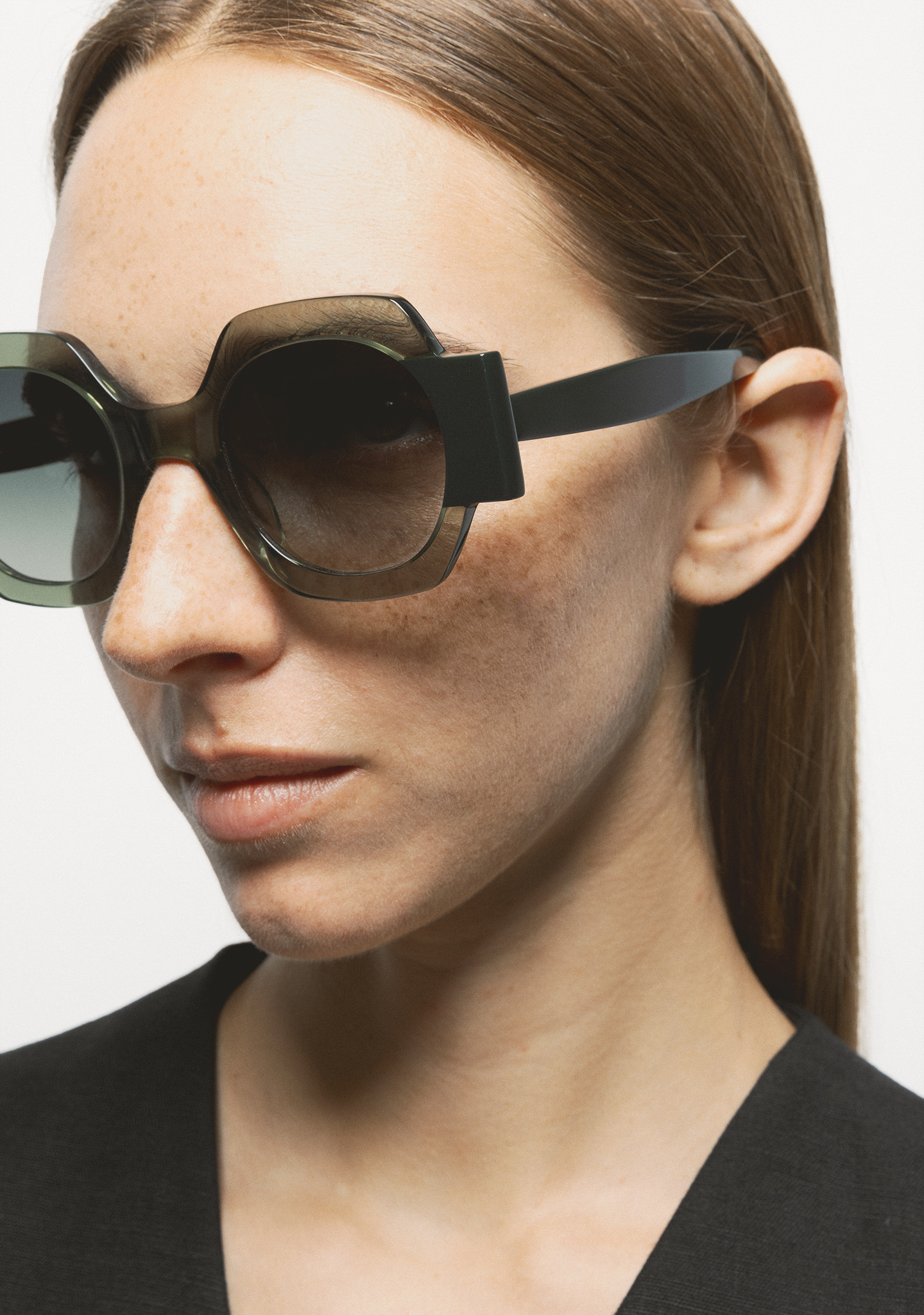 Occhiali da sole di forma quadrata. Frontale in acetato verde trasparente con laminato verde scuro. Aste in acetato verde scuro. Lente verde degradé base 2 con protezione UV 100% e trattamento antiriflesso. Lente Categoria 2. Plaquettes in acetato incorporate. Fatto a mano.