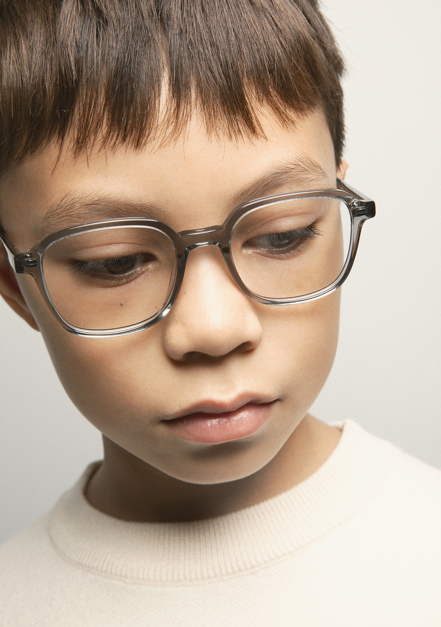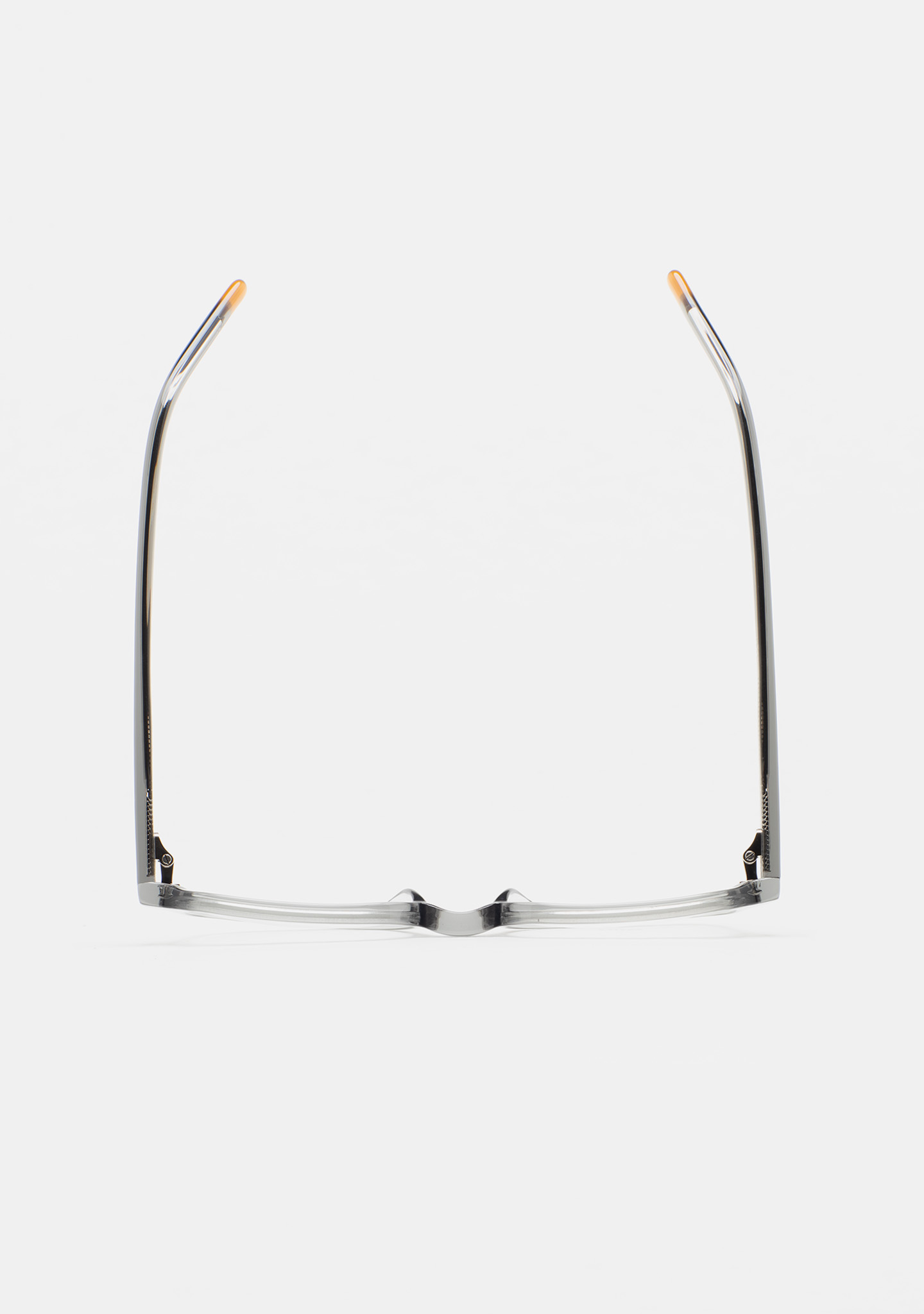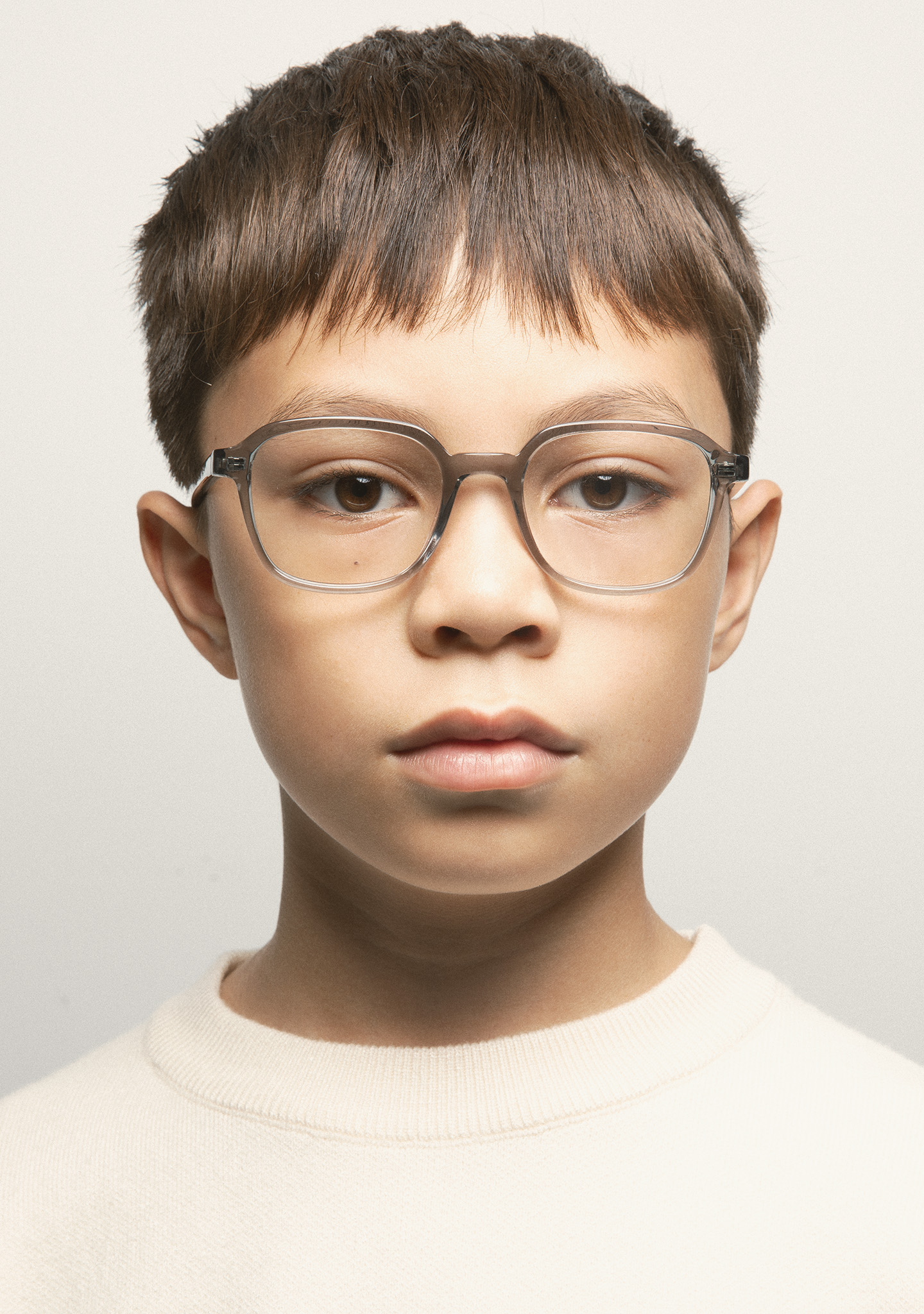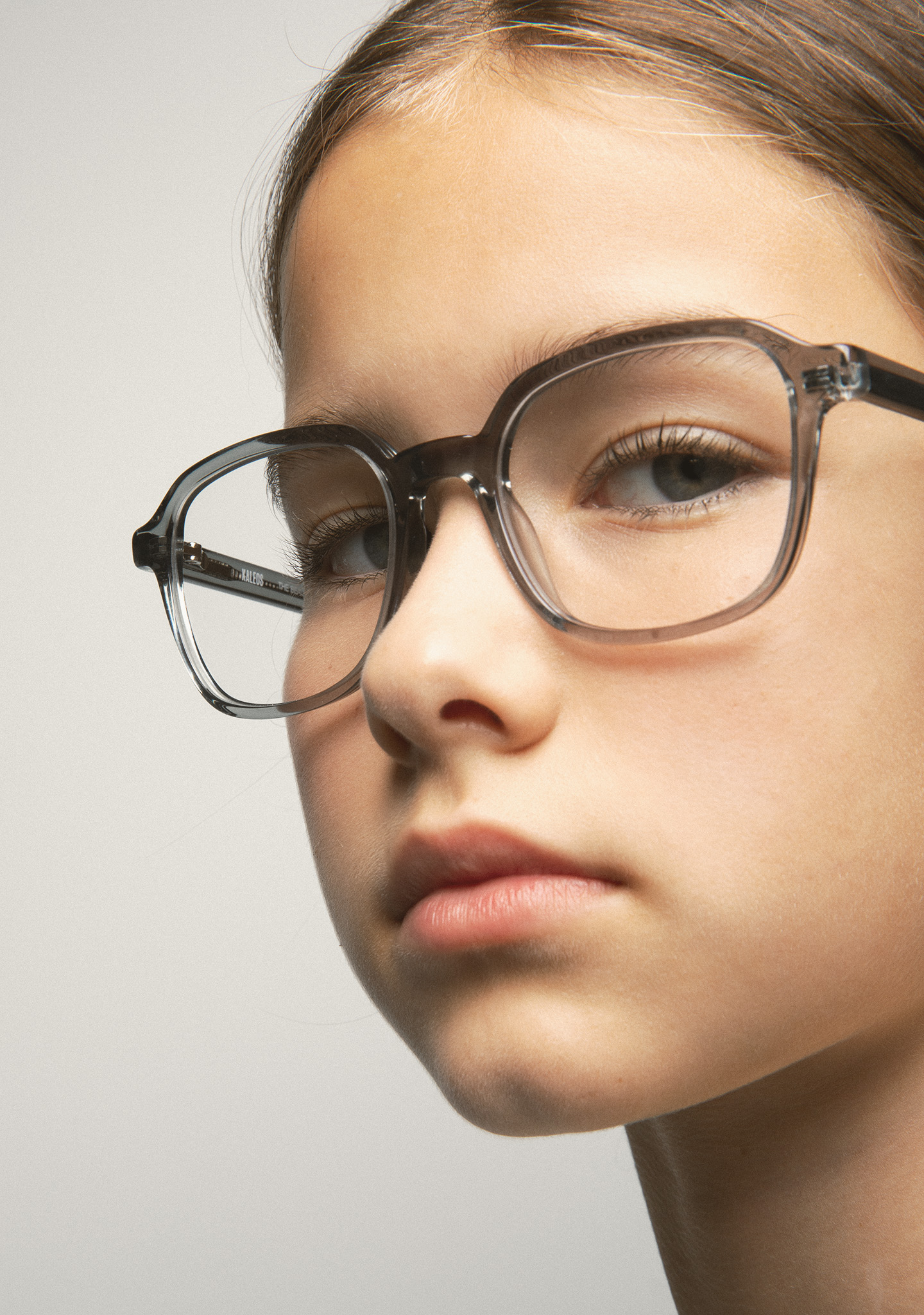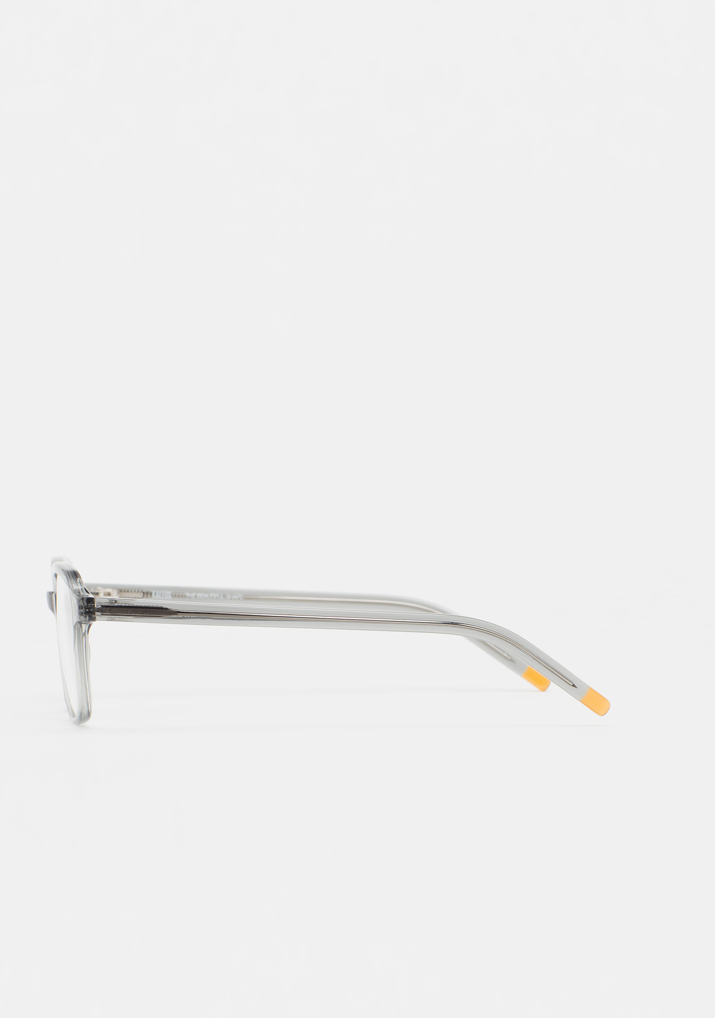 Occhiali da vista KIDS a forma rettangolare. Frontale e aste in acetato grigio trasparente. Terminali ambra. Piastrine in acetato integrate. Realizzati a mano.
